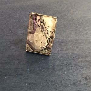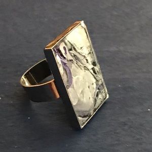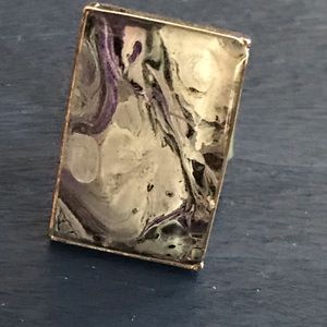 Paint skin and resin oblong ring. Ring is silver tone and is adjustable. Colors are black, white hints of purple shades.