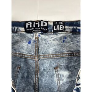 These men's jeans in size 42/34 feature a unique paint splatter pattern on a blue denim fabric with an acid wash finish. The garment has a mid-rise fit with a straight leg style and a 5-pocket design, suitable for a regular fit. The jeans are detailed with distressed accents, providing a skater or urban fashion aesthetic. Measurements in pics. Thanks for looking! B18