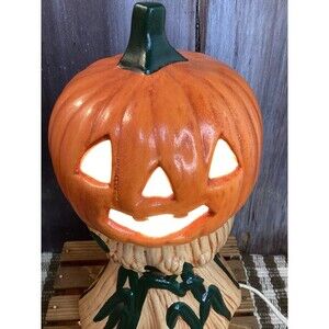 This is a fantastic handcrafted pumpkin light. The ceramic decoration was made in 1977 and signed by the maker. It stands about 8" tall. Included is the original power cord and a small light bulb. The cord has an on/ off toggle switch. Everything works properly. See pictures for more detail. No damage.