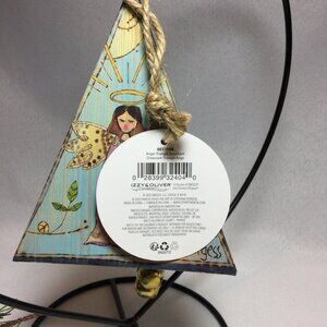 Crafted of tin with paper decoupage, this 2022 three-sided triangle ornament features two praying angels and the words "Peace on Earth." Jingle bells hang from the interior of the triangle and the bell ornament hangs from a jute hanger. Designed by Stephanie Burgess for Enesco's Izzy and Oliver line, this ornament is unique and no longer available through Enesco. Comes with the original hang tag.