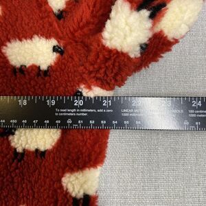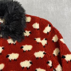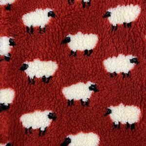 Features a unique red sherpa fleece exterior with adorable white and black sheep print throughout