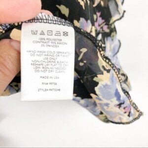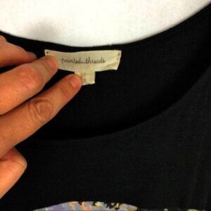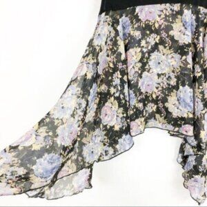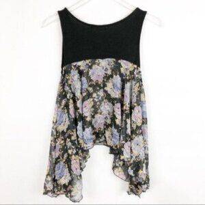 Painted Threads tank style blouse. Black floral print with white and blue flowers. Handkerchief hemline in size S.