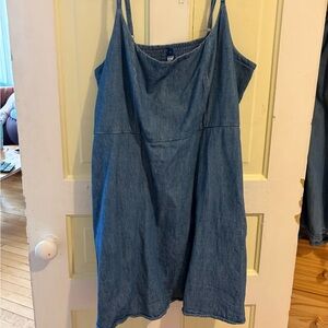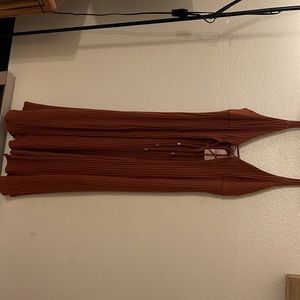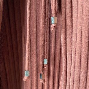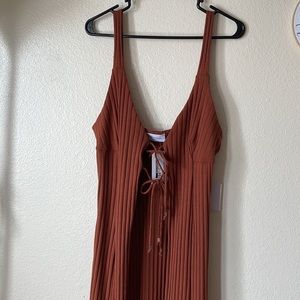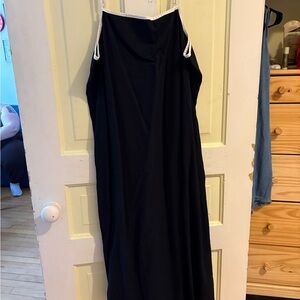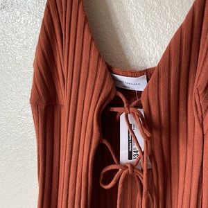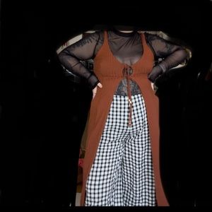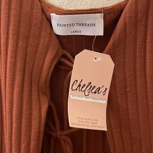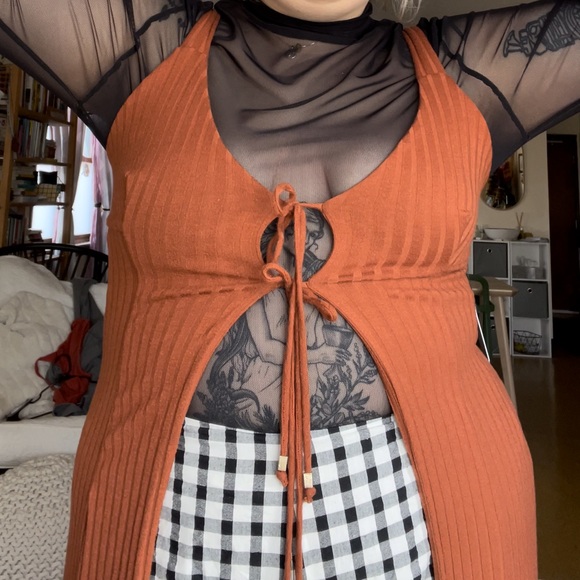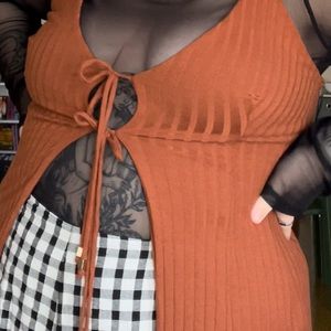Cute tie front long thin strap top. Goes great with jeans, could be worn with a turtle neck or bra free! So many choices! Size large but this fits me (size 18)