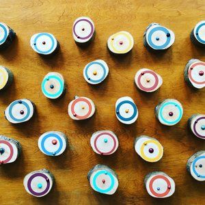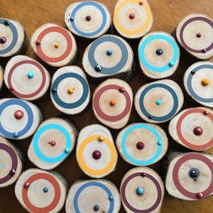 This art is so much more than just a painting. It is meant to bring happiness and good vibes to your space! They are easily hung individually with a simple push pin tack and can easily be rearranged if you want to switch up the look. Please message me with any questions. You will receive the exact artwork shown in the photos. 24 painted wood slices each between 2 3/4" and 3 1/2". Each slice is 1 1/4" thick. Look up Nests And Burrows on FB and IG to see lots more! Message me with questions please. Free US shipping.