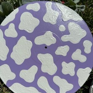 Painted Vinyl Cow print - lavender. Acrylic painted 12” vinyl. Coated sealed. 100% upcycled materials. Custom colors available.