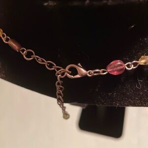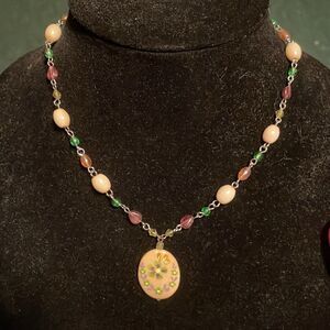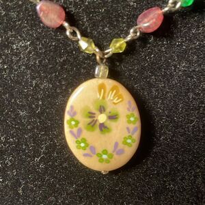 Pretty for Spring or Summer, this painted ceramic pendant with green, amber, pink and cream beads on chain is a beautiful accessory.