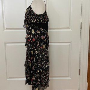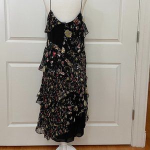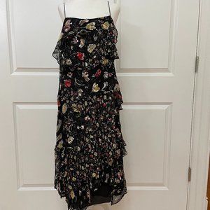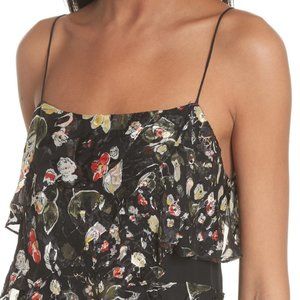 Mixed-scale floral patterning highlights the fluttery tiered ruffles of this strappy dress made from airy devoré and smooth satin.