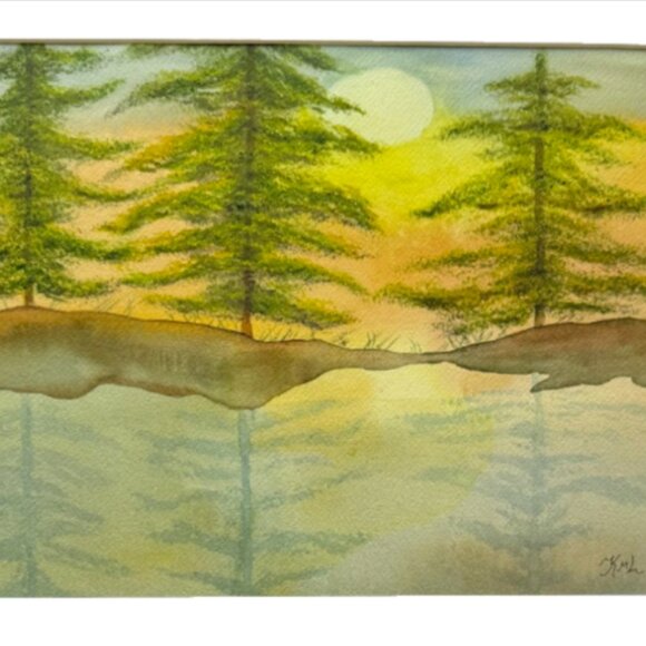 Sunset Evergreen Trees and Lake Landscape Colorful Watercolor Painting Shades of Blue, Green, Orange, Yellow, Gray and Brown Original Artwork This Is Not a Print One of a Kind The Size of the Painting is 11" Tall x 14" Wide Includes a White Mat that Is 16"x20" Ready to Be Placed in a Standard Sized 16x20 Frame The frame is not included Painted on Arches 140lb cold pressed water color paper and Winsor & Newton watercolor paints Acid Free White Mat The painting is signed with initials K M L on the front and a full signature Kathleen Lewandowski on the back. The Condition Is New