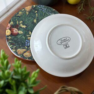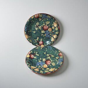 Pair of 8″ salad/dessert plates by Certified International with artwork by Susan Winget. Classic holiday collage and called "Evergreen" —apples, pears, grapes and holly on deep green with a red rim. Backstamped as shown.