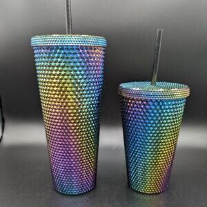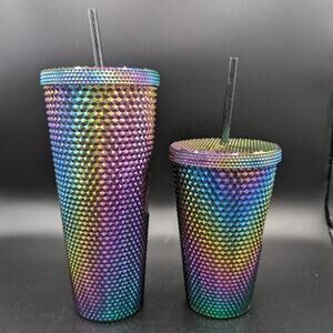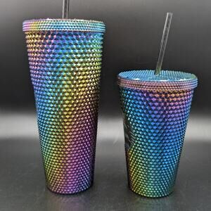 Pair (2) of Starbucks Oil Slick Studded Rainbow Cups with Straws. Set includes the 16 oz & 24 oz Cold Cup Tumblers. One of each. One straw has sticker residue on it. I don't see any chips or cracks. See photos for details.