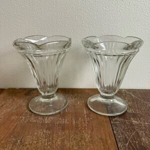 Pair (2) Vintage Clear Ribbed Pedestal Glass Diner Parfait Sundae Glasses