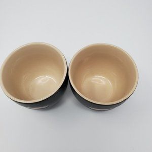 Up for offer here is a pair of promotional advertising YOURS and MINE handle-less dessert cup mugs from Bailey's Irish Cream, or Creme. Measure approximately 3.5" wide x 2.75" tall. Excellent condition. Black matte glaze exterior, cream white interior, with red and gold Your and Mine inset banners.