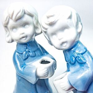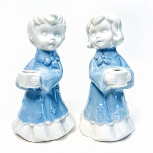 White porcelain girl and boy angels in blue dress; candle holders for mini taper candles.