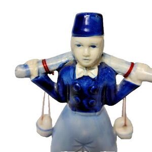 This product is a pair of vintage figurines of a Dutch man and woman with bells, made of porcelain/ceramic. The blue and white color scheme, along with the hand-painted glossy finish is typical of these type of vintage items. Standing at 6.75 inches tall, these original pieces are a unique addition to any decorative vintage bell, pottery, glassware, or Dutch collection.