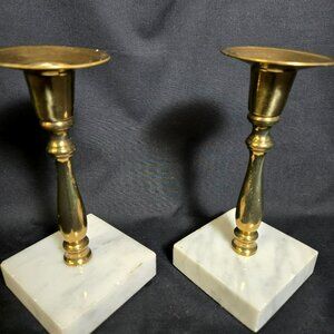 Pair Brass & Marble Candlestick Holders 6" Mid Century Modern Square Base Vintag