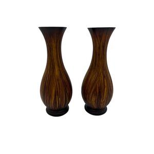 This charming pair of vintage-style faux bois resin / plastic vases features detailed raised designs — one vase displays a serene forest cabin, while the other showcases a majestic deer and fawn in a woodland setting. Both vases stand approximately 6.5" tall and are crafted to resemble carved wood, adding rustic warmth to any space. Ideal for lodge, cabin, or nature-themed decor, these decorative vases are lightweight and sturdy, perfect for use as standalone pieces or as part of a woodland display.