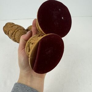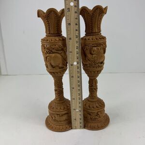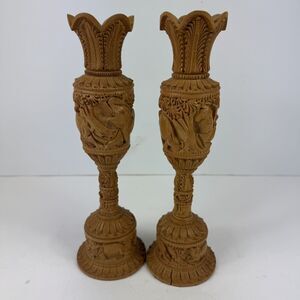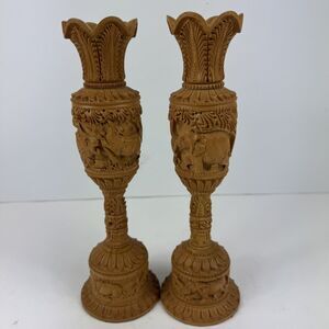 This is a pair of hand-carved wooden flower vases from India, featuring a vintage design with intricate floral patterns and animal characters such as elephants and lions. The vases have a bottle shape, beige color, and are made of wood with engraved details. They measure 10 inches in height and 2.5 inches in width, suitable for wall mounting or free-standing display in a living room. This unique home decor item adds an artistic touch with an Art Deco style and a theme focused on animals.