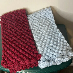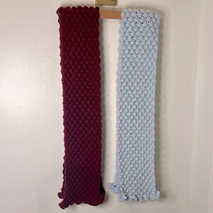 Pair Handmade Knit Wool Blend Vintage Blue & Burgundy Popcorn Rectangle Scarves