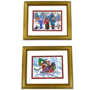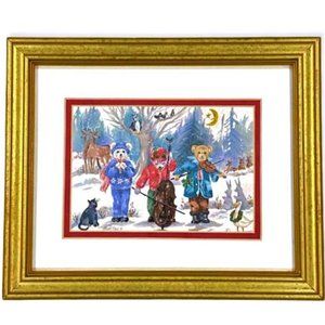 Pair Helen Paul Winter Christmas 11.5" x 9.5" Gold Framed Art Prints Teddy Bears