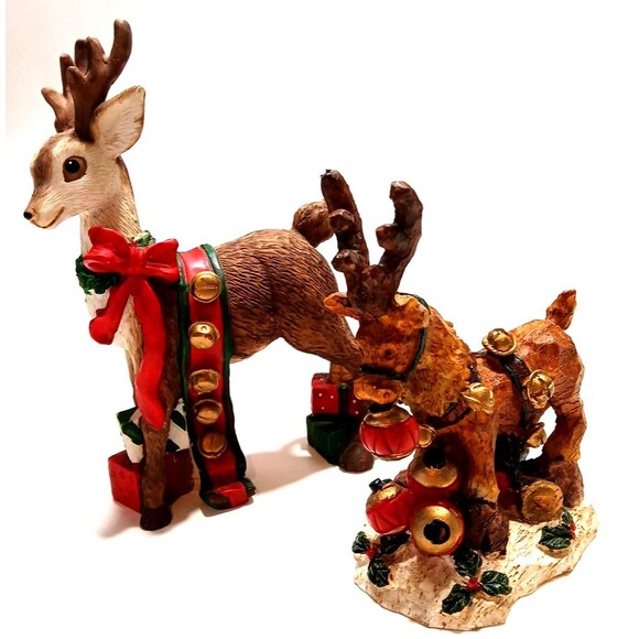 This is a pair of reindeer figurines that are adorned with sleigh bells and bows. The tallest is 7 inches tall and the smaller one is 5.5 inches tall. Made of resin and featuring a multicolor design, these little pair are perfect for adding a festive touch to your holiday decor. Christmas themed and ready to add some extra joy to your home during the holiday season. Please see pictures for more details.