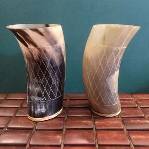 Pair Of Viking Style Horn Drinking Flagons Wooden Base 6.25" H 12oz