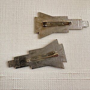 These vintage Art Deco brooches have a sleek gold and black design, offering a bold addition to a jacket for a stylish touch.