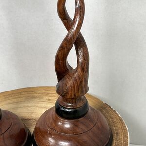 These vintage carved wood candlesticks stand at 12 inches tall with a swirl pattern, perfect for adding a touch of mid-century modernism to any home decor. The multi-tone brown color and rustic design make them suitable for all occasions, adding an artistic and romantic flair to any space. Crafted from wood, these candle holders are a charming addition to a cabin, cottagecore, or period-inspired setting, adding a touch of unique style to your home.