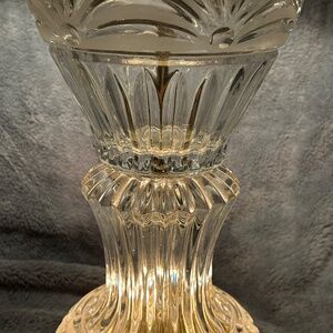 π€ Item Description: Pair of gorgeous 24% lead crystal lamps made by crystal clear industries in Yugoslavia. Hollywood regency characteristics of ornate crystal and brass elements. Showcases an intricate frosted geometric lined design.