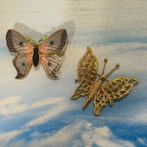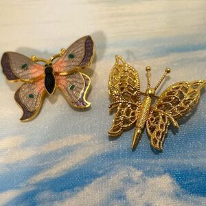 2piece Brooch Pins, in elegant gold-tone metal & multicolor enamel. The fish signed brooch showcases pastel cloisonné enamel detailing. The monet butterfly brooch has intricate 3D filigree wings, giving it a delicate and figural look. Both brooches are signed and secured with a rollover clasp closure.