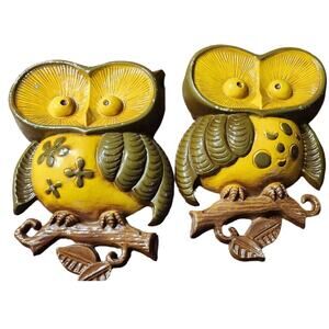 Pair Retro Sexton USA Owl Wall Plaque #970 Set Cast Metal 70s Avocado Green VTG