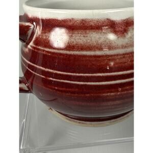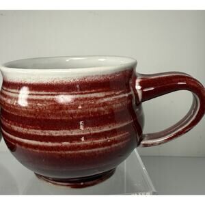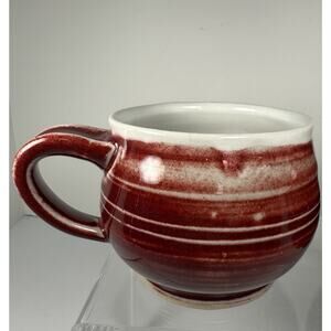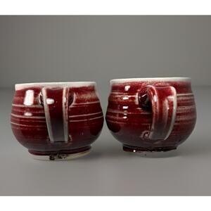 Beautiful pair of studio pottery mugs in a striking cranberry red and light gray/taupe color. Mugs are stamped/signed "S" with a few unique bottom swirl and rim. I am unable to identify the potter/artist.