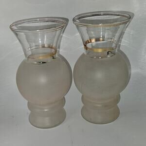Pair Vintage 6" Frosted Glass Vases Hand Painted White Flowers Green Leaves Gold