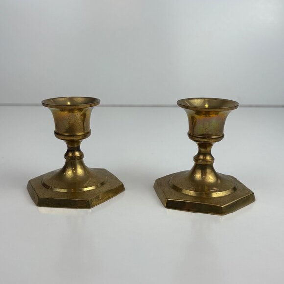 A refined pair of vintage brass candle holders with hexagonal bases and a height of 2.5 inches. Made in India, these pieces add elegance to decor.