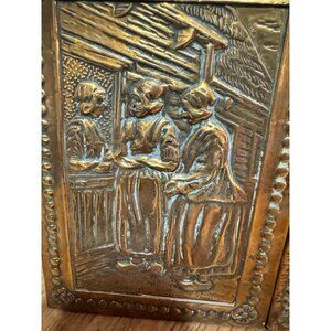 Charming embossed wall plaques in the repoussé style, each showing a cozy cottage or tavern scene. One features women in conversation; the other depicts two men talking beneath a bell.