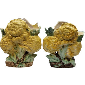 These vintage McCoy pottery chrysanthemum vases stand at 8 1/4" tall and are made of ceramic in an art pottery production style. The floral pattern and tall shape make them perfect for displaying flowers or as decorative pieces in a room. With an original design and impressed backstamp, these vases are a charming addition to any collection or home decor. Made in the United States, these vases showcase the quality craftsmanship and unique style that McCoy pottery is known for.