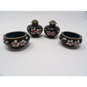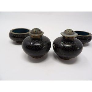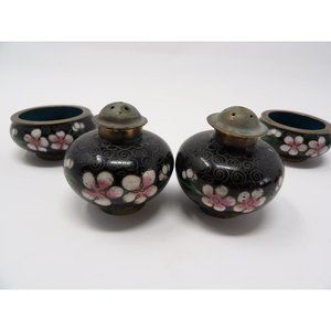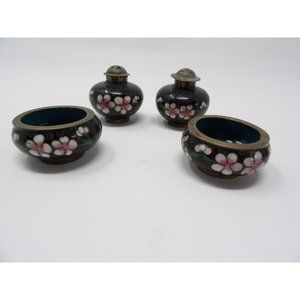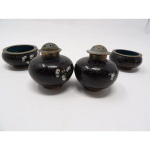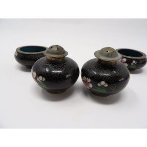 Pair of Vintage Salt Cellars & Pepper Shakers. Black with White Enamel Painted Flowers. Brass tops on pepper shakers & brass rims on salt cellars. Resembles cloisonne. Rust spot inside one salt cellar. Please see photos.