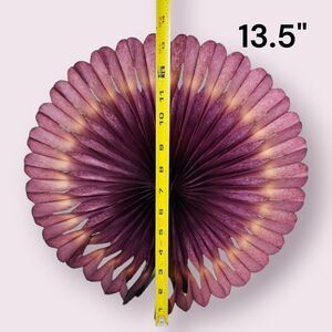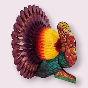 Ready to bring some retro charm to the table? This is a pair of large vintage Thanksgiving turkey honeycomb decorations with gorgeous purple plumage and bright, colorful bodies (one green, one purple). They make a striking display together classic mid-century party décor that still opens and folds beautifully.