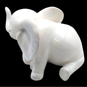 Pair Vintage White Porcelain Elephants Signed Tony Sitting & Standing Trunk Up