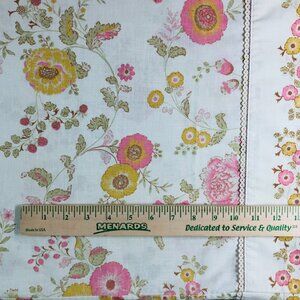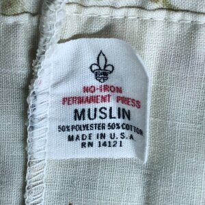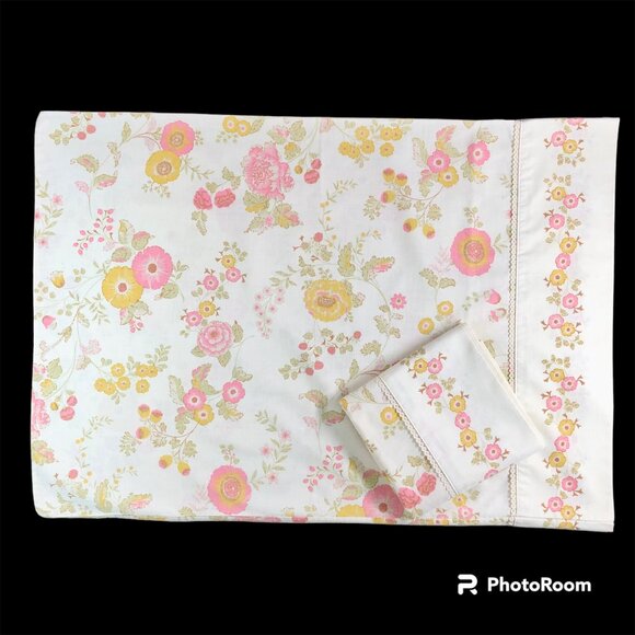 Pair vintage Ely & Walker muslin pillowcases. Made in the USA of 50% polyester, 50% cotton. Floral pattern of roses & raspberries in dusty pinks, greens, and rust on a cream background. Please note! The background is NOT white! Very good condition with no holes, tears, or ripped seams. There are a couple of small spots that appear to be excess printing ink and a small place at the band where the fabric was not sewn into the seam. It is NOT a hole, just a spot where the needle missed the fabric edge. Please see all photos for details. Smoke free, pet friendly home.