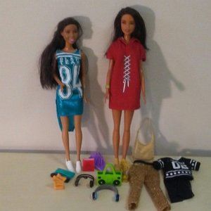 Pair of Barbie dolls with accessories including 2 music trophies, head set with mic, headphones, two purses, extra outfit with "Inspired" top and gold leggings, tote bag made like boom box, book and hair brush. Doll in red is wearing a hoodie dress and one in teal is wearing a tank dress.