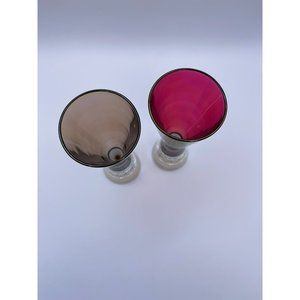 Pair of Beautiful, Modern, Gold Filigree Champagne Flutes, Heavy Bottom, 6 3/4” tall. One is an amber color and the other is a rose-pink. Pressed glass, very heavy. Great condition, with no chips, breaks, cracks or marks. Stamped with a 21 on the bottom of each is the only identifiable mark. Sold and shipped from a clean, smoke-free home.
