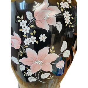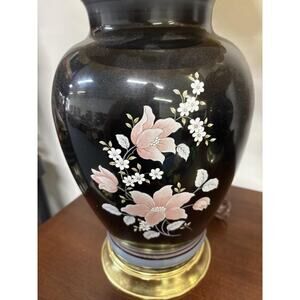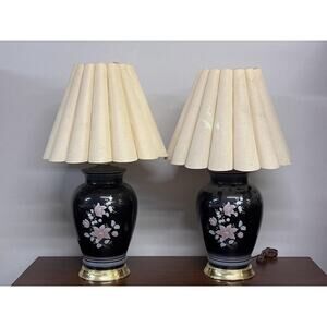 This pair of vintage table lamps features black ceramic bases hand-painted with a delicate floral motif. Both lamps are fully functional, but one shade has visible stains and the other shade is coming detached from it's top mount.