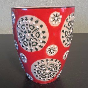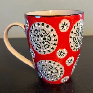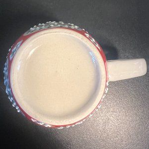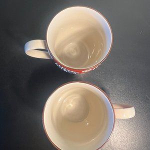 Set of 2 Bohemian pattern ceramic glazed mugs by Chehoma feature a wrap-around embossed design in burnt red with floral navy blue and beige circular patterns with raised dots in relief. Decorative deep brown ring around rim. Beige interior matches curved, comfortable handle.