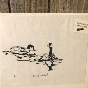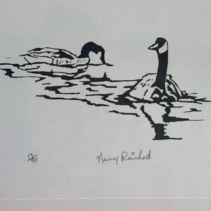 Pair of Canada Geese Floating, Vintage Black & White Hand Pulled Serigraph Hand Signed by Artist Nancy Reinhold & Numbered 13/90. On Cardboard Back to Keep From Bending, Sealed in Original Plastic Wrap. Ready to Frame.