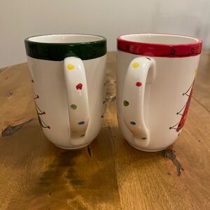 Each mug features one green, and one red, tree with lights. One mug is trimmed in dark green, the other in red.