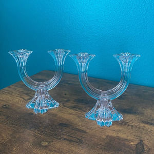 Pair of Clear Glass Art Deco Style Candelabra Candlestick Holders