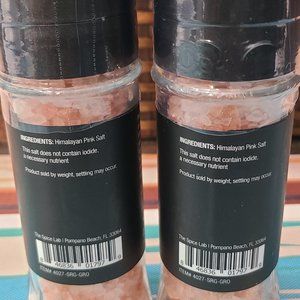 Pair of Coarse Grain Himalayan Pink Salt The Spice Lab Best Used By 10-13-2027. These two, 4.2-ounce, streamlined sealed glass jars have ceramic grinders for a smooth, clean grind. This salt ranges in color from sheer white to varying shades of pink; with the darker colors indicating an increased number of beneficial trace elements and iron. It is mined from deep inside the Himalayan mountains and is perfect for use on grilled meats, fish, ribs, eggs, vegetables, soups, stews, and pasta salads. It's also great for baking. Moreover, this salt is kosher, non-GMO and gluten-free. NEW.