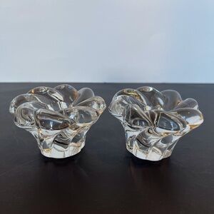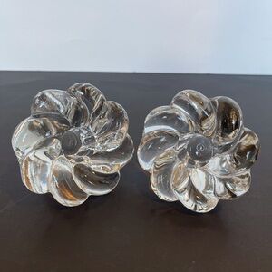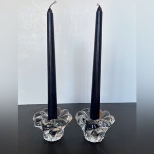 Beautiful, heavyweight candlesticks with a scalloped floral design. H 2 3/8in x Top Diameter 3 3/8in x Bottom Diameter 1.75in. Very Good condition. 3 Tiny Glass imperfections are noted, very difficult to notice. Candles not included.