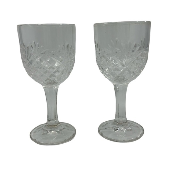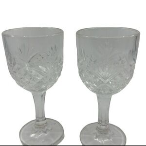 These beautiful small crystal glasses are perfect for serving your favorite drinks. They are 5 inches tall and have a delicate, intricate design. They are in excellent condition and ready to be enjoyed.