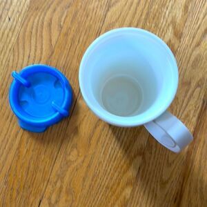 Durable plastic mug/cup with a lid. Lid has a closure feature.
